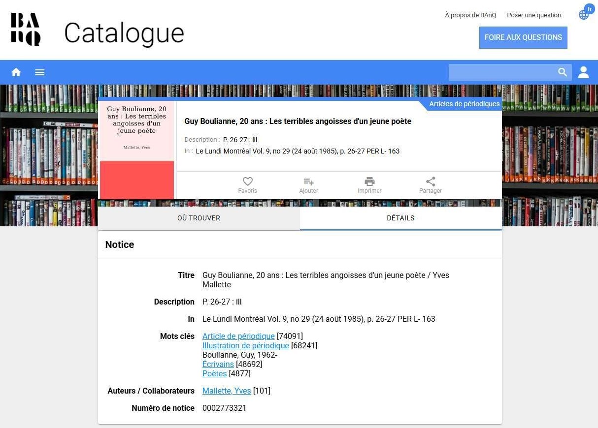 JE LANCE UN APPEL — Je viens de retrouver la référence exacte du magazine Le Lundi dans lequel j’avais obtenu une entrevue il y a 40 ans (BAnQ). Il s’agit du Vol. 9, no 29 (24 août 1985). Si quelqu’un trouve une copie, je suis preneur.
