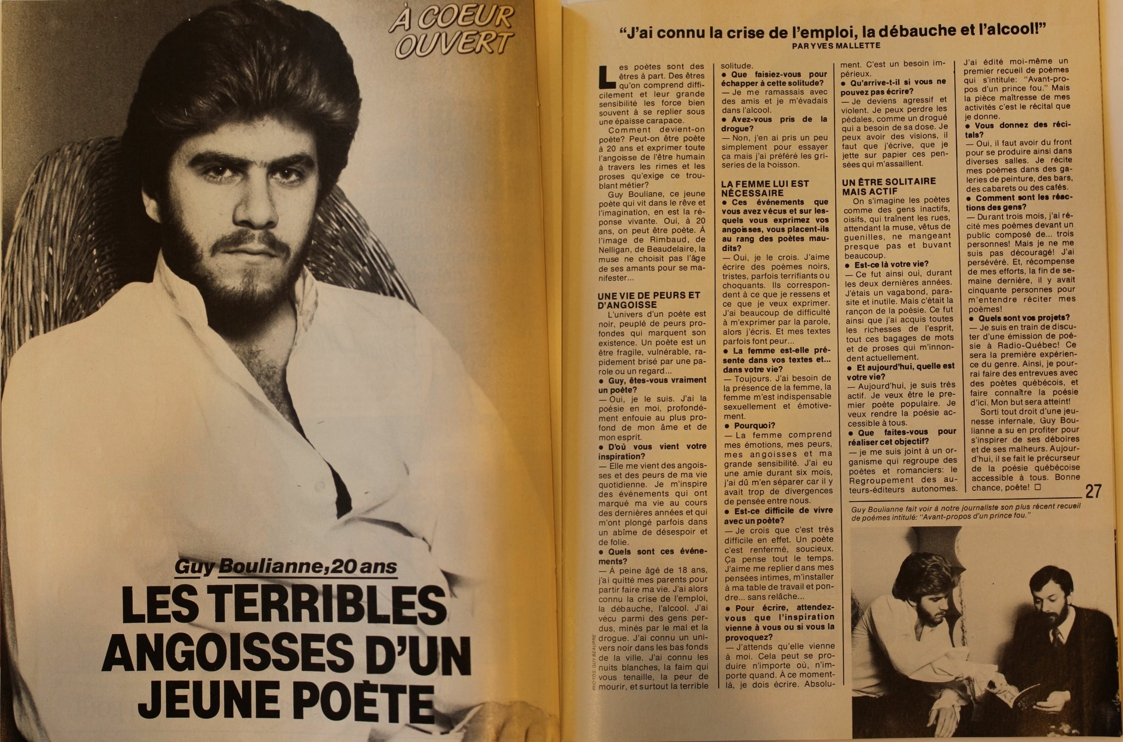 Comment devient-on poète ? Peut-on être poète à 20 ans et exprimer toute l’angoisse de l’être humain à travers les rimes et les proses qu’exige ce troublant métier ? Les poètes sont des êtres à part. Des êtres qu’on comprend difficilement et leur grande sensibilité les force bien souvent à se replier sous une épaisse carapace. Guy Boulianne, ce jeune poète qui vit dans le rêve et l’imagination, en est la réponse vivante. Oui, à 20 ans, on peut être poète. A l’image de Rimbaud, de Nelligan, de Baudelaire, la muse ne choisit pas l’âge de ses amants pour se manifester …