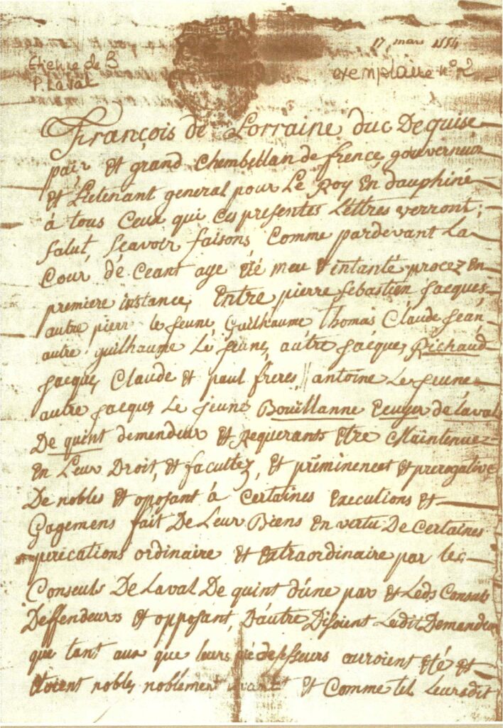 Il se présente sous la forme de deux textes différents, dont le but est de démontrer la véracité des preuves fournies par les Bouillanne et les Richaud pour rester dans le corps social de la noblesse et ainsi bénéficier des exemptions inhérentes à cet état. Le premier acte date du 17 mars 1554 et le second du 15 juillet 1667. Les originaux de chacun de ces actes doivent se trouver aux archives de Grenoble. Ce document a été établi à la fin du XVIIe siècle, et nous est parvenu rédigé de l’écriture de cette époque, ce qui facilite beaucoup la lecture de l’acte de 1554.