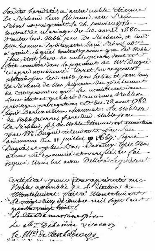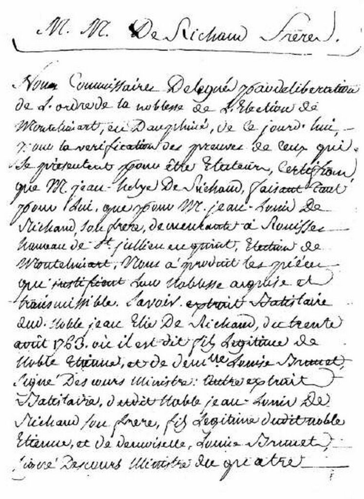 Quoi qu’il en soit de cette anecdote, les preuves multipliées de la noblesse des maisons de Richaud et de Bouillanne, consignées dans les registres de la chambre des comptes, et le peu de monuments qui leur restent pardevers, la présentent comme si ancienne, qu’il n’y a pas beaucoup de maisons dans la province qui puissent prouver au-delà; et quoique, depuis longtemps, la plupart des individus aient été pauvres, il paraît qu’on les a toujours tenus, en général, pour d’honnêtes gens (Antoine Barnave, Mémoire, 1787).