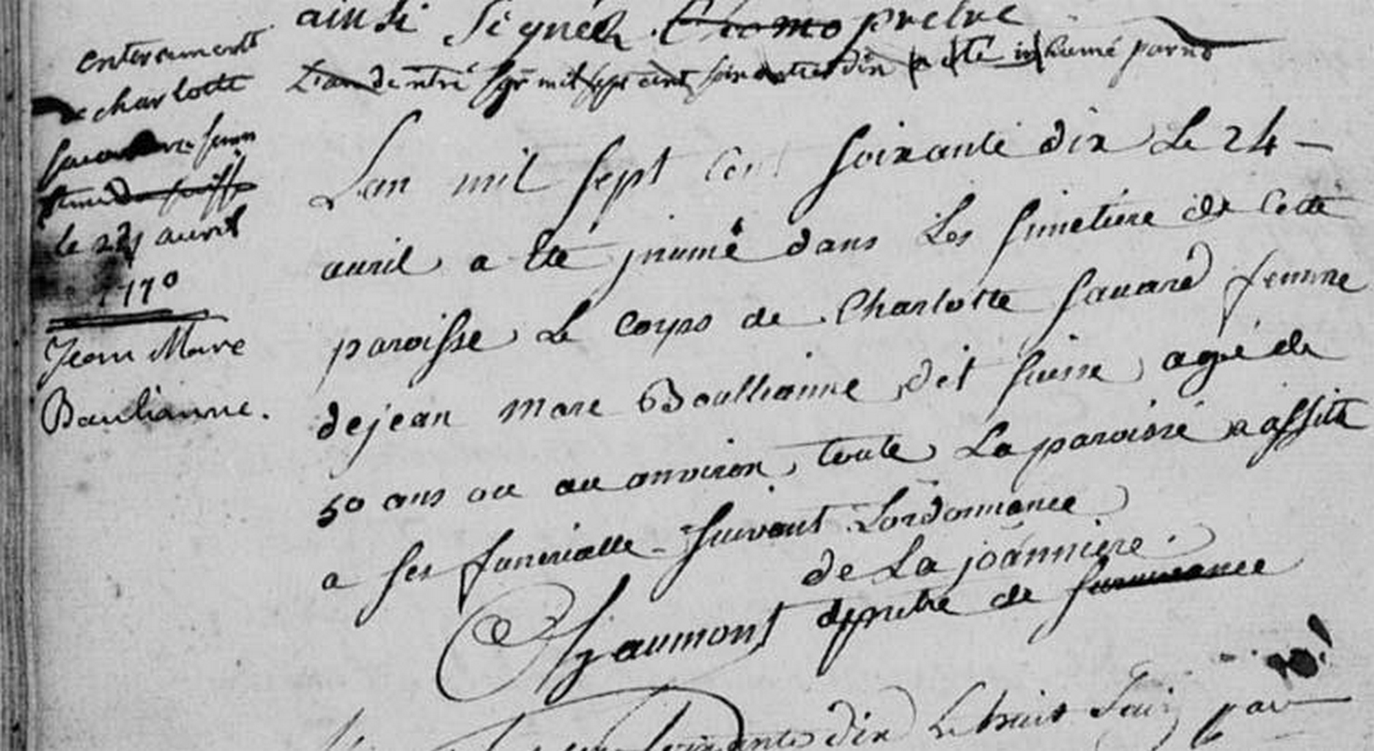 Tout nous porte à croire que le jeune Jean-Marc s’embarqua à partir de La Rochelle, alors ville et port d’allégeance protestante, où il aurait pu se sentir en sécurité. Il viendra s’établir à l’Île-aux-Coudres sur les rives du fleuve Saint-Laurent. Le 18 novembre 1739, il épouse à Petite-Rivière-Saint-François, Charlotte Savard, née vers 1714, fille de Joseph Savard et de Marie-Josephte Morel. [7]