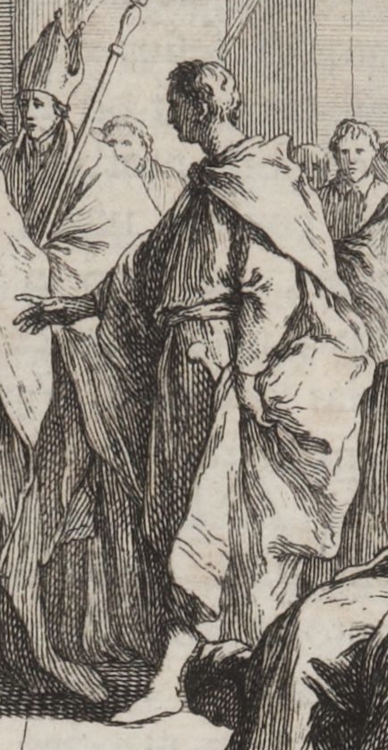 Récemment, j’ai redécouvert la gravure de Charles-Nicolas Cochin (père) extraite de l’Histoire générale de Languedoc, avec des notes et les pièces justificatives, par Dom Claude de Vic & Dom Joseph Vaissette (Preuves de l’histoire de Languedoc, page 1. Édition de Jacques Vincent, tome 2, Paris 1733). On y voit clairement le prince Ursus, vicomte de Nîmes, aux côtés de l’évêque Gibert, de Walafrid évêque d’Uzès, et de plusieurs autres prélats et abbés, lors de l’invention des reliques de saint Baudile en 878. Celui-ci porte l’épée en tant que dignitaire et haut personnage.