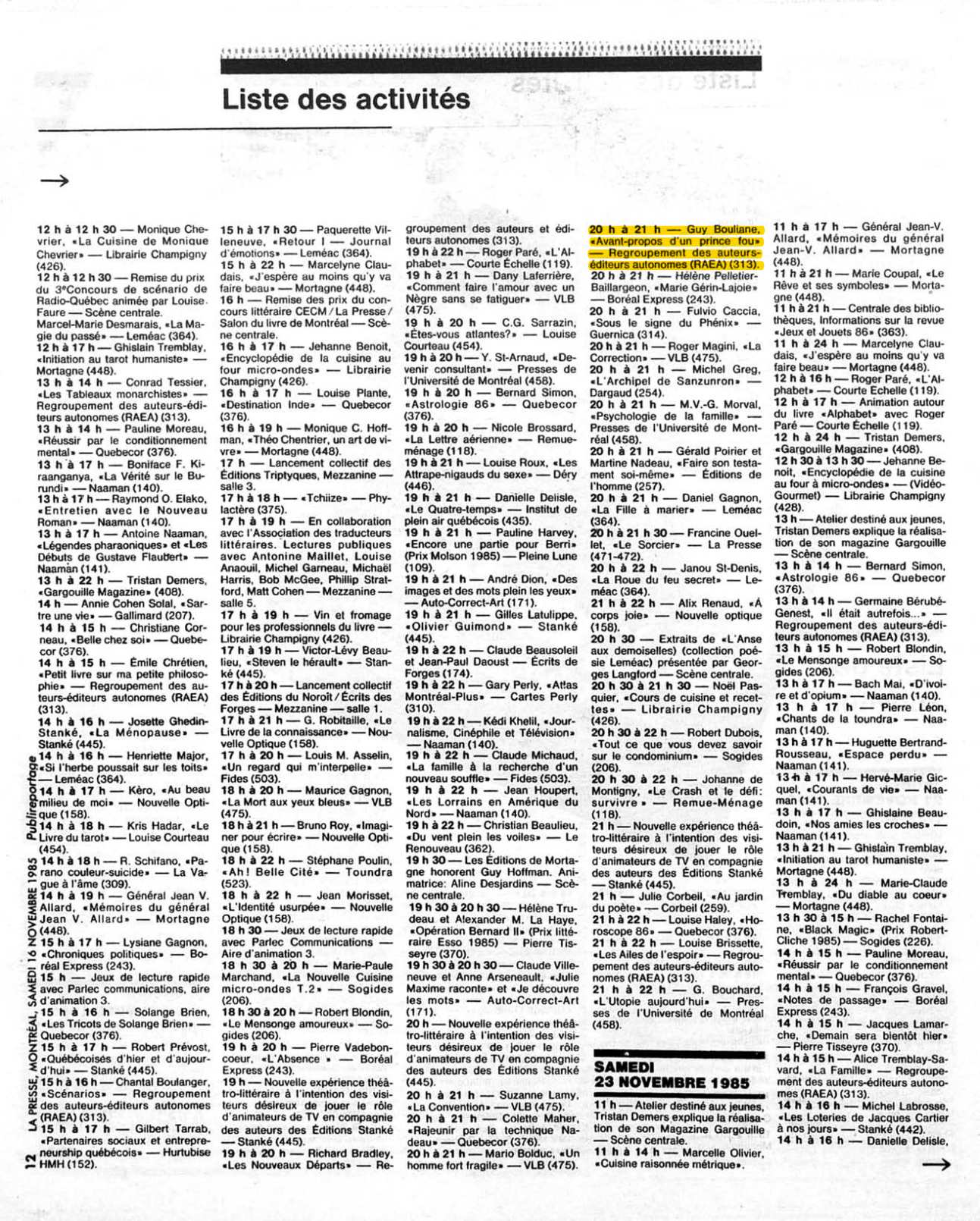 La Presse, 16 novembre 1985, Publireportage. Le Salon du livre, page 12