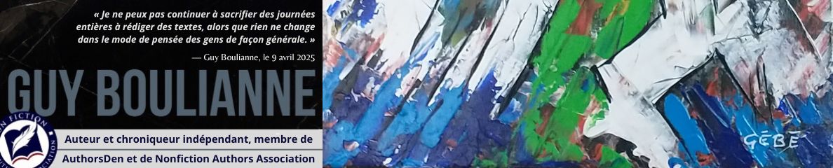 En tant qu’auteur et chroniqueur indépendant, Guy Boulianne est membre du réseau d’auteurs et d’éditeurs AuthorsDen et de la Nonfiction Authors Association (NFAA) aux États-Unis. Il adhère à la Charte d’éthique mondiale des journalistes de la Fédération internationale des journalistes (FJI).