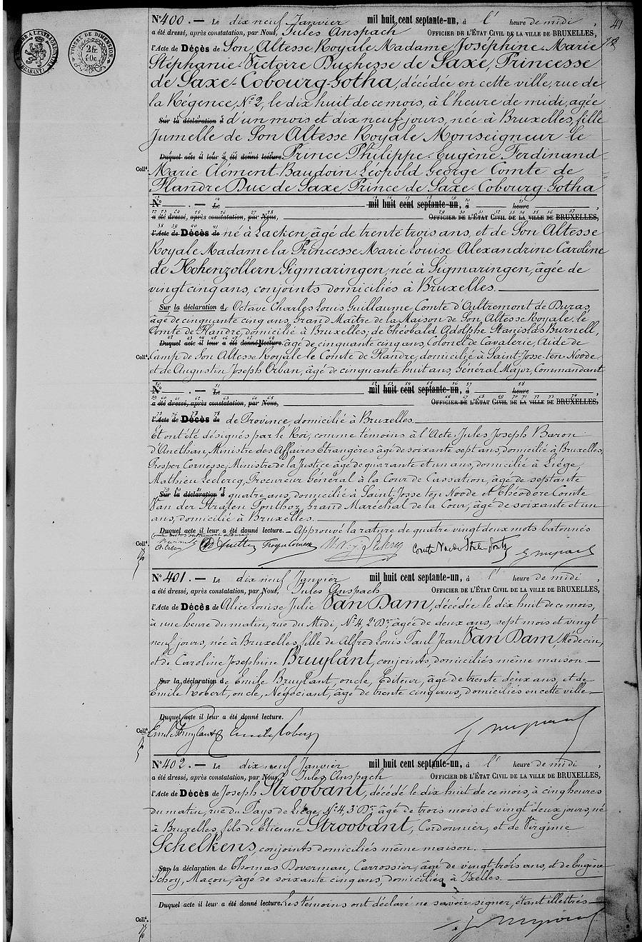3. Henriette de Belgique – Acte de décès de sa jumelle (1871)