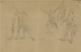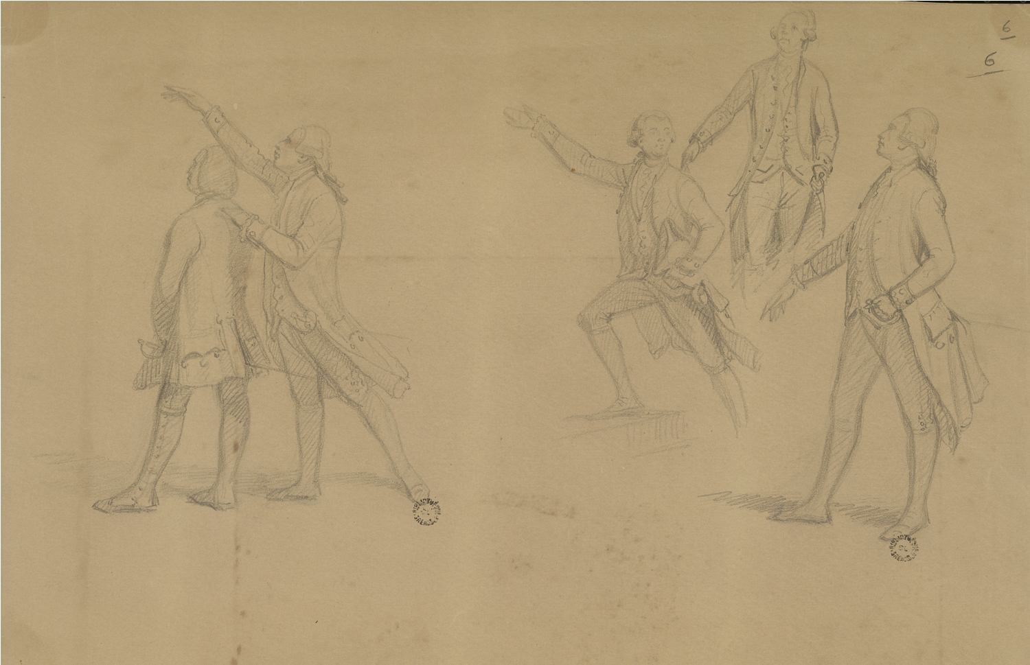 Quatre croquis au crayon et fusain sur papier gris. Le chevalier de Murinais (n°31) tient par l’épaule de Richaud (n°30). Le marquis de Langon se tient debout, main sur son épée (personnage n° 48)