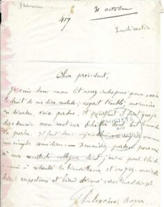 Lettre écrite et signée de la main de Philoxène Boyer, 1 page in-8 (13,5 x 20 cm) plus page d’adresse, au Président de la Société des Gens de Lettres