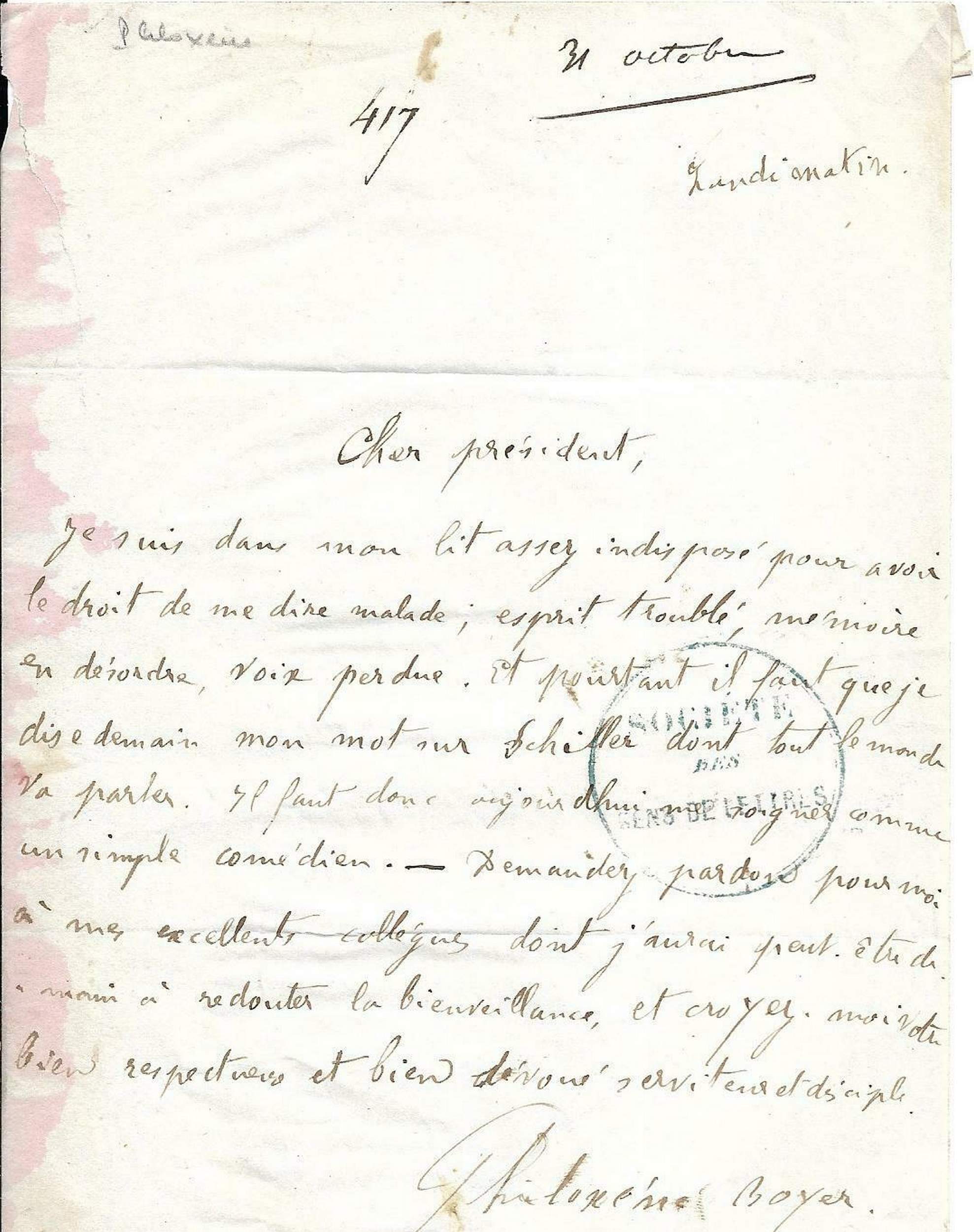 633110cookie-checkLettre écrite et signée de la main de Philoxène Boyer, 1 page in-8 (13,5 x 20 cm) plus page d’adresse, au Président de la Société des Gens de Lettres