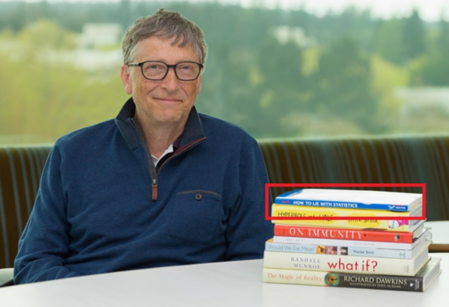 Serons-nous étonnés de constater que le livre qui est bien mis en évidence par Bill Gates, tout en haut de la pile, est le livre “How to Lie With Statistics” (Comment mentir avec les statistiques), de l’écrivain américain Darrell Huff. Gates écrit de ce livre :