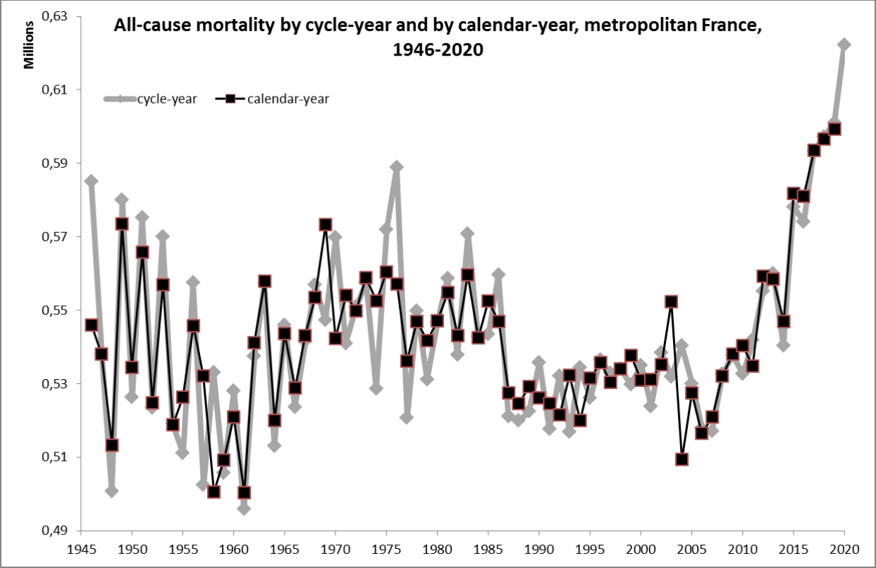 Un article scientifique écrit par Pr Denis Rancourt, Dr Marine Baudin et Dr Jérémie Mercier publié sur la plateforme ResearchGate démontre après analyse de la mortalité toutes causes confondues en France depuis 1946 (chiffres de l’Insee) que :