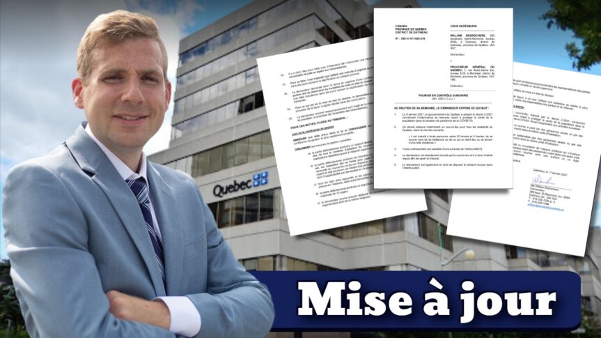 Le 21 janvier dernier, je vous annonçais que l’avocat de Gatineau, Me William Desrochers, avait déposé un pourvoi en contrôle judiciaire devant la Cour supérieure du Québec afin de contester le couvre-feu imposé par le gouvernement de François Legault dans le cadre de la crise sanitaire. Ce recours s’ajoute à ceux entrepris au Manitoba, en Alberta, en Colombie-Britannique et à la demande en justice déposée par les avocats Jean-Félix Racicot et Guylaine Lacerte au nom des Entrepreneurs en Action du Québec.