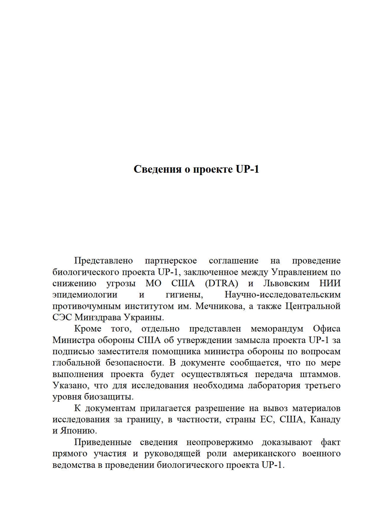 Nous pensons que les documents reçus témoignent de la violation effective par les États-Unis et l’Ukraine des obligations découlant de l’article 4 de la BTWC et de la résolution n° 1540 du Conseil de sécurité des Nations Unies du 28 avril 2004.