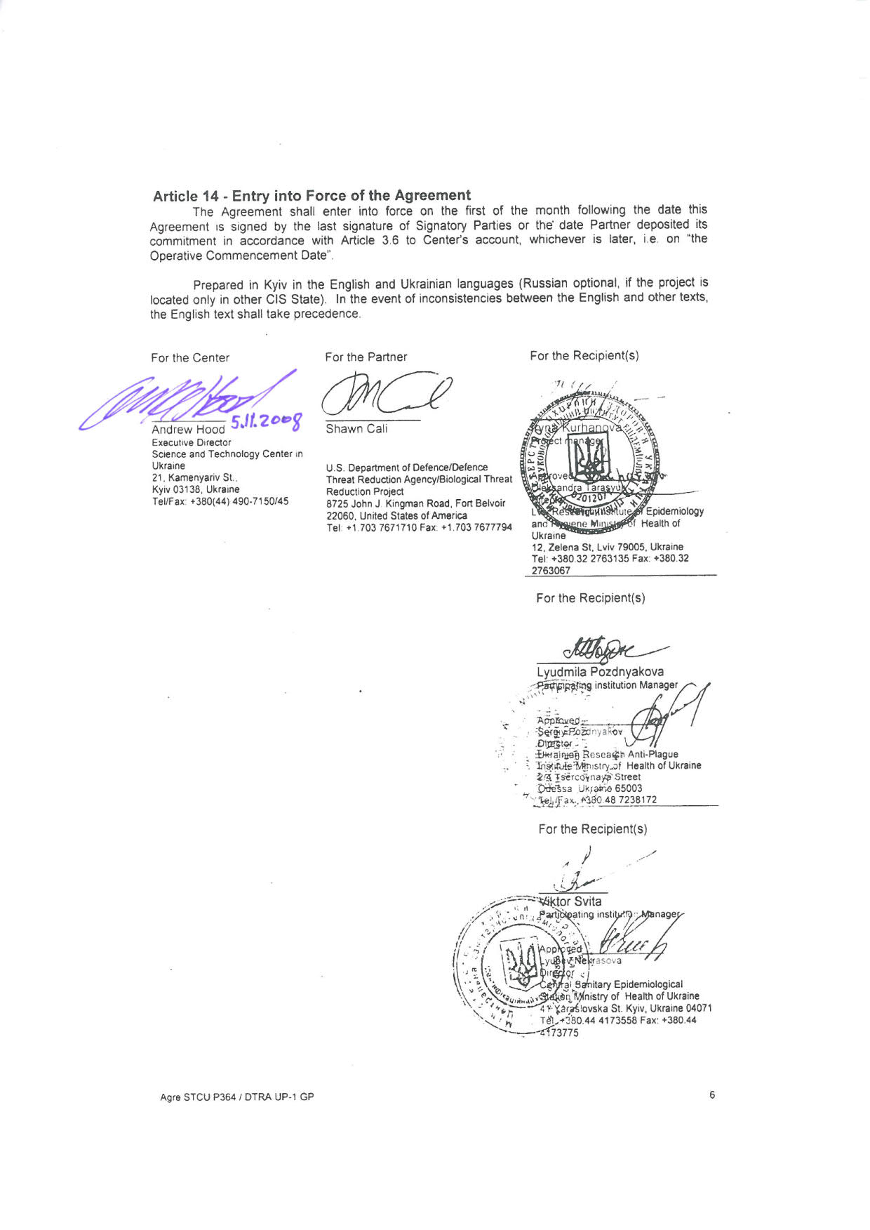 Les questions de modernisation des laboratoires ont été supervisées par Scott Thornton. En outre, il a conseillé le personnel local sur la gestion des agents pathogènes à haut risque dans le cadre des projets ukrainiens DTRA.