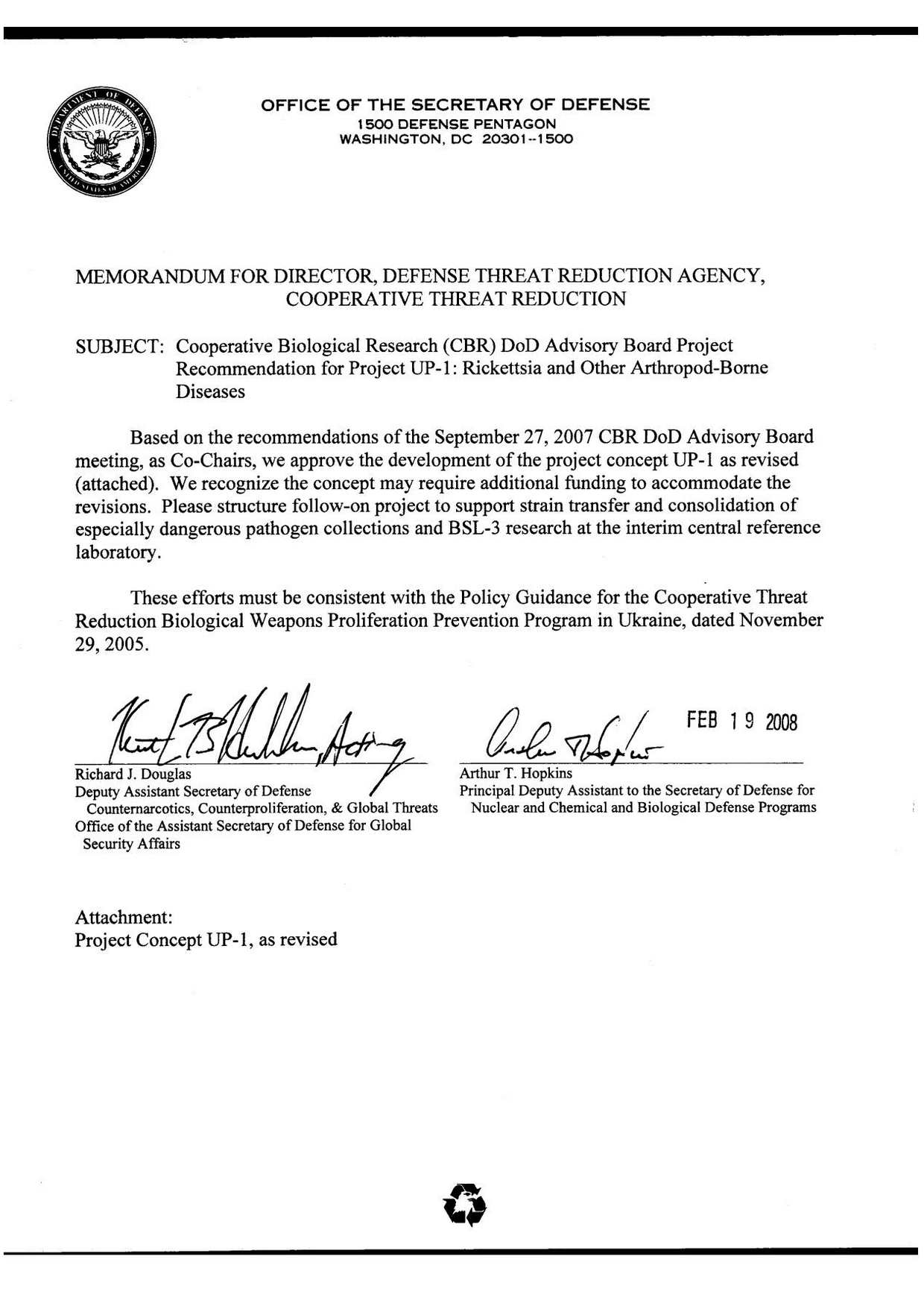 L’un des personnages clés est Robert Pope, alors employé de la DTRA et directeur du Cooperative Threat Reduction Program, dont le but était d’impliquer les États de l’espace post-soviétique dans les activités biologiques militaires. Il est également l’auteur de l’idée de créer le Dépôt central des micro-organismes particulièrement dangereux à Kiev.
