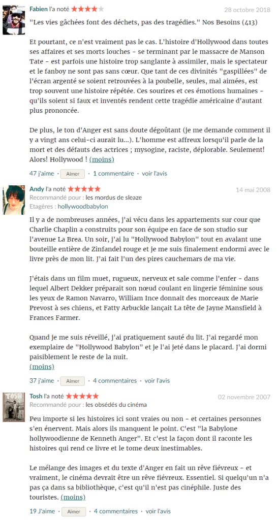 Veuillez prendre en note,— et ceci est très important —, que je n’ai pas fait l’acquisition du livre de Kenneth Anger parce que je suis en admiration devant l’homme. J’ai acheté ce livre tout simplement parce que j’aime avoir sous la main des ouvrages que je considère être de collection, surtout lorsqu’ils proviennent de l’édition originale ou qu’ils s’y en approchent le plus. Il y a un autre aspects que je tiens à souligner : si l’on veut connaître le monde qui nous entoure et dans lequel nous vivons, il nous faut nous intéresser à toutes ses facettes, même celles qui vont à l’encontre de nos propres principes.