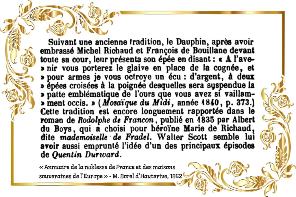 Je me suis pris d’attachement pour le personnage de Quentin Durward car le roman historique de Sir Walter Scott lui fut inspiré par la légende entourant ma famille. En effet, la légende des « Fils de l’Ours » raconte que les de Bouillane et de Richaud sauvèrent d’une mort certaine un des princes souverains de Dauphiné, à la chasse dans la forêt de Malatra, sur les pentes d’Ambel. Les uns l’appellent simplement un Dauphin et les autres Louis, fils de Charles VII, plus tard, Louis XI. L’origine de cette famille dauphinoise a un caractère qui paraîtrait romanesque, si elle n’était appuyée par des documents historiques et par toutes les traditions du pays. Michel Richaud, bûcheron de la vallée de Quint, au comté de Die, et François Bouillane, son voisin et son compagnon, sauvèrent la vie au roi Louis XI, alors dauphin, dans la forêt de Vercors, en abattant un ours blessé, qui grimpait à sa poursuite le long d’une roche où il s’était réfugié.