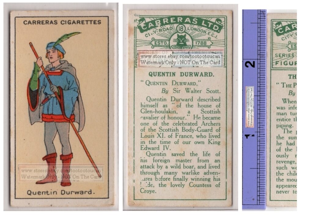 J’ai fait l’acquisition d’une petite pièce de collection. Il s’agit d’une carte à cigarettes illustrant le personnage principal du roman historique écrit par Sir Walter Scott, publié pour la première fois en 1823, traduit et réédité à maintes reprises : « Quentin Durward ». Bien que je l’aie acheté au prix très modique de 5,00 $ sur la place de marché eBay, ce petit objet est pratiquement introuvable partout ailleurs. Cette carte à cigarettes fut publiée et distribuée en 1924 par la compagnie de Tabac Carreras (Carreras Tobacco Company). Celle-ci a une dimension de 2 5/8 po. x 1 3/8 po. (6.5 cm x 3.5 cm) et elle faisait partie à l’origine d’un ensemble de 25 cartes représentant différents personnages de romans et de légendes. Au recto se trouve l’image du héros Quentin Durward, tandis qu’au verso se trouve une courte description du roman de Walter Scott.