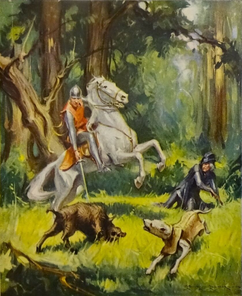 Toujours est-il que Walter Scott,— tout comme Albert du Boys pour son roman « Rodolphe de Francon » —, s’inspira de la légende de notre famille pour écrire son roman « Quentin Durward ». Quentin Durward, noble écossais d’une vingtaine d’années, vient chercher fortune en France afin d’échapper à l’habit monacal. Épris de l’idéal chevaleresque, il veut d’abord se mettre au service de Charles le Téméraire. C’est par la force des circonstances, pour échapper au gibet, qu’il se retrouve au service de Louis XI. Il s’engage dans la garde écossaise comme écuyer de son oncle, le Balafré. Dans une partie de chasse, Louis se trouve en grand danger face à un sanglier. L’intervention de Quentin lui sauve la vie. Cet épisode est donc à rapprocher de la légende des de Bouillane et de Richaud, l’ours (symbole de royauté) étant remplacé par le sanglier (symbole de spiritualité). Je vous invite à lire cet article publié en 2020.