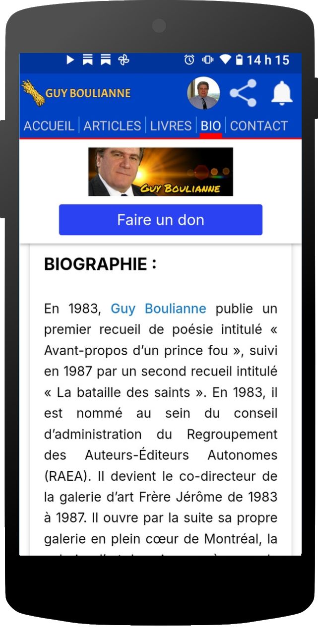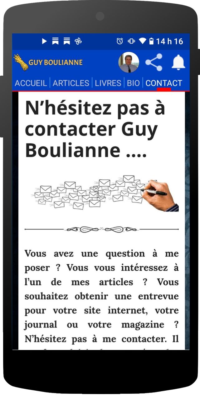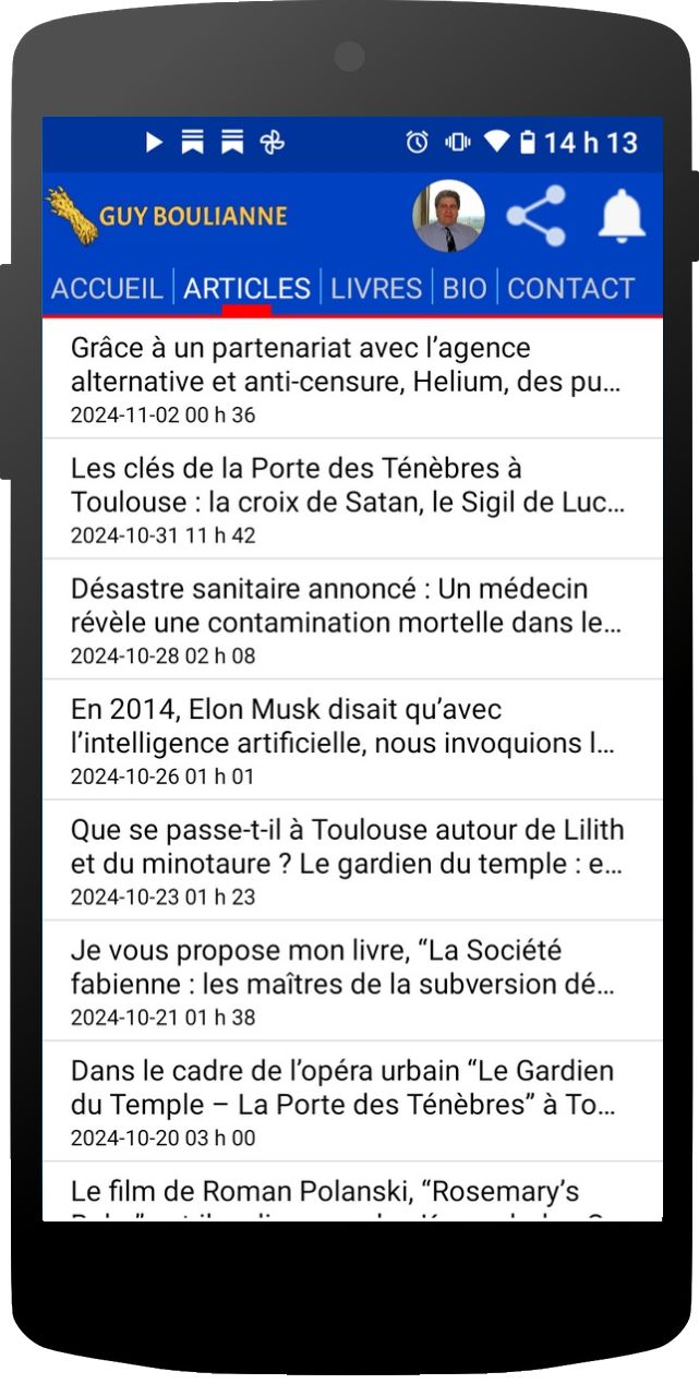 Vous pourrez consulter mes plus récents articles tels qu’ils sont affichés sur mon site internet officiel : Actualités, Santé, Science, Technologie, Politique nationale et internationale, Nouvel Ordre Mondial, Société, Histoire, Spiritualité et Recherches diverses. Il est certain que vous ne raterez jamais une nouveauté. De plus, grâce à mon application Android, vous aurez accès à Radio Impact et vous pourrez ainsi écouter de la musique que vous entendrez rarement ailleurs, tout en naviguant sur internet ou sur d’autres applications !