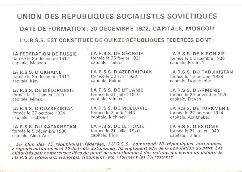 En fouinant dans mes archives j’ai retrouvé ce document, oh combien intéressant, puisqu’il parle de la création de l’Ukraine au XXème siècle et en donne la date. L’Agence de presse Novosti, en 1987, y précise la date de création (par les bolchéviks?) de la R.S.S. d’Ukraine avec Kiev comme capitale le 25 décembre 1917 et de la Fédération de Russie avec Moscou comme capitale également le 25 décembre 1917; je n’ai pas trouvé de trace d’un Etat ukrainien (sous ce nom) avant cette date … par contre vers le IXème siècle on trouve la Russie Kiévienne, aussi appelée Rousse de Kiev, Ruthénie.