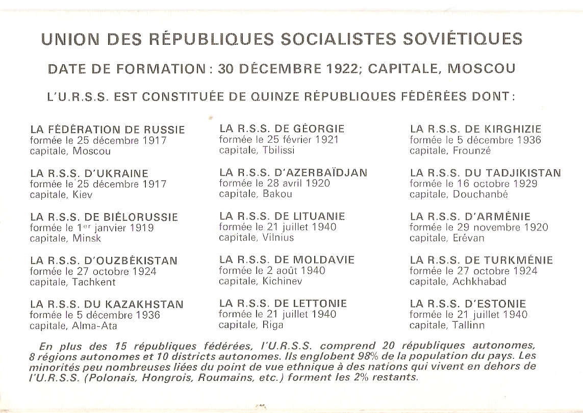 En fouinant dans mes archives j’ai retrouvé ce document, oh combien intéressant, puisqu’il parle de la création de l’Ukraine au XXème siècle et en donne la date. L’Agence de presse Novosti, en 1987, y précise la date de création (par les bolchéviks?) de la R.S.S. d’Ukraine avec Kiev comme capitale le 25 décembre 1917 et de la Fédération de Russie avec Moscou comme capitale également le 25 décembre 1917; je n’ai pas trouvé de trace d’un Etat ukrainien (sous ce nom) avant cette date … par contre vers le IXème siècle on trouve la Russie Kiévienne, aussi appelée Rousse de Kiev, Ruthénie.