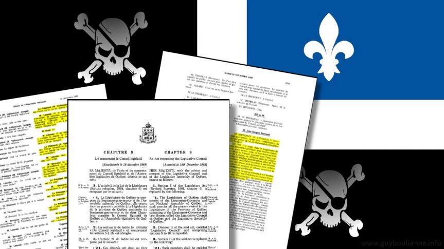 Or, je suis au regret de vous dire que la province de Québec a été piratée (« hacked ») depuis longtemps, c’est-à-dire depuis le début de la « Révolution tranquille » qui permit aux conjurateurs de mettre en place une gouvernance sans entraves. Ceci donna les pouvoirs aux députés de faire et de défaire les lois au gré de leurs humeurs et de leurs désirs, comme on peut le voir dans ce débat surréaliste entre la députée du PLQ, Marwah Rizqy, et la vice-première ministre du Québec, Geneviève Guilbault. Mais comment cela a-t-il été rendu possible ? Tout simplement par l’abolition du Conseil législatif du Québec qui prit effet le 31 décembre 1968, sans même avoir créé au préalable un organisme pour protéger la constitution. Jusque là, la Chambre haute avait le pouvoir de modifier ou de rejeter les projets de loi, les protégeant contre une Assemblée législative dominée par la majorité. Mais désormais, la nouvelle Assemblée nationale assumait tous les pouvoirs qui sont attribués à la Législature du Québec.
