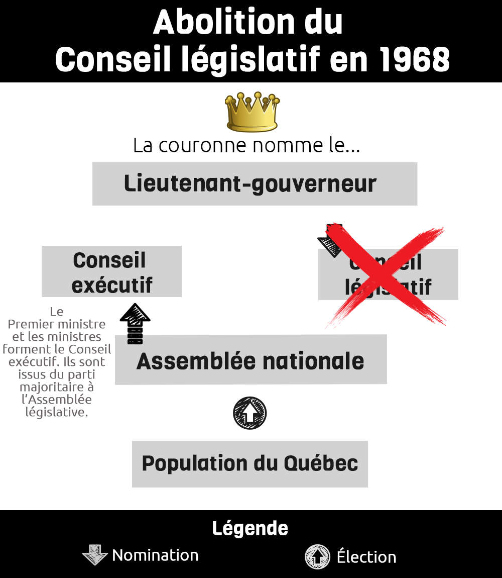 Le 31 décembre 1968, le Conseil législatif a été aboli et l’Assemblée législative du Québec a été rebaptisée Assemblée nationale. En conséquence, le Québec a maintenant une législature monocamérale. Le gouvernement de l’Union nationale du premier ministre par intérim Jean-Jacques Bertrand a adopté la loi, connue sous le nom de « projet de loi 90 », pour mettre en œuvre le changement. Les gouvernements précédents avaient fait des tentatives infructueuses pour éliminer la Chambre haute. En fait, la première tentative remonte à Félix-Gabriel Marchand, à la fin du XIXe siècle. Le Québec a été la dernière province canadienne à abolir sa Chambre haute. Au moment de sa dissolution, elle comptait 15 membres de l’Union nationale et 9 membres du Parti libéral.