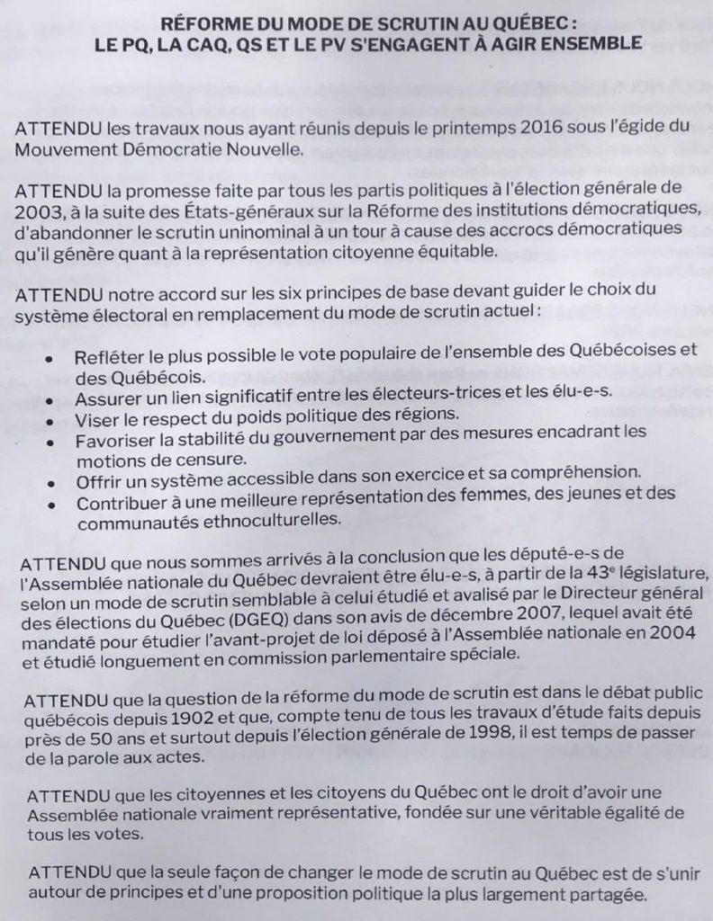 Ci-haut : Monsieur Alex Tyrrell, chef du Parti Vert du Québec, a partagé sur Twitter l’entente que les quatre partis politiques ont signé avec François Legault en 2018 pour réformer le mode de scrutin.