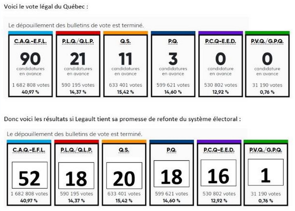Le 3 octobre, lors des élections générales provinciales, nous avons malheureusement constaté que la Coalition avenir Québec a fait élire une forte majorité de députés avec seulement 41% du vote populaire, soit 90 des 125 élus (72%). Mais si le gouvernement de François Legault avait tenu sa promesse de réformer le mode scrutin comme il l’a promis en 2018, le portrait de l’Assemblée nationale aurait été bien différent, selon les calculs de Radio-Canada. Un parti a donc à nouveau remporté la majorité des sièges à l’Assemblée nationale sans que la majorité des électeurs ait voté pour lui, déplore le Mouvement démocratie nouvelle. « Une fois de plus, notre système électoral archaïque hérité de la période coloniale et construit pour un système bipartisan a révélé ses graves lacunes », estime son président Jean-Pierre Charbonneau. « Tout le monde a pu constater, en cette soirée électorale, cette grave anomalie qui fait qu’un parti remporte une majorité écrasante, alors que près de 60 % de la population a voté contre lui. »