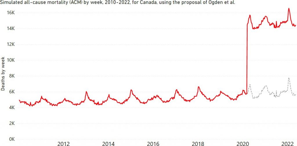 - D’une part, la mortalité toutes causes confondues excédentaire pendant la période Covid (du 11 mars 2020 au 14 mai 2022 inclus) au Canada est de 22 500 décès.