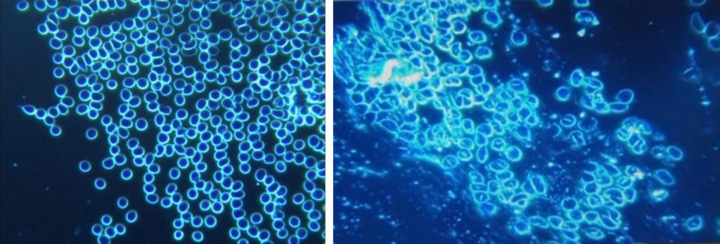 Sur les 1 006 sujets, 426 étaient des hommes et 580 étaient des femmes et 141 d’entre eux n’ont reçu qu’une seule dose de l’injection expérimentale d’ARNm, 453 ont reçu une deuxième dose et 412 ont reçu une troisième dose. L’âge moyen des 1 006 sujets était de 49 ans et leur âge variait de 15 à 85 ans. En moyenne, 5,77 % des 1 006 personnes avaient des échantillons de sang normaux malgré leurs symptômes de la COVID-19. Les 94,23% restants avaient des échantillons de sang anormaux, comme illustré dans les 4 cas que nous avons sélectionnés sur les 12 qui étaient normaux avant de recevoir des injections d’ARNm mais qui n’étaient plus normaux par la suite. Pour chaque cas, une goutte de sang a été prélevée en piquant un doigt et a été analysée au microscope à fond noir ZEISS Primostar ou LEITZ Laborlux 12. L’observation du sang au microscope optique en fond noir a eu lieu en moyenne trente jours après la dernière inoculation. D’un minimum de 5 à un maximum de 20 photographies ont été prises pour chaque patient examiné. Toutes les observations initiales ont été faites à un grossissement de 40x à l’exception des agrandissements numériques de 3x à 120x pour certains objets d’intérêt. Les mesures ont été réalisées avec le logiciel DeltaPix InSight.