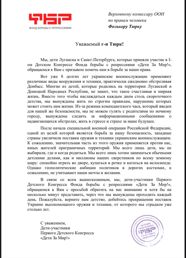 Les militants des droits de l’homme de la Fondation pour la lutte contre la répression espèrent sincèrement que le premier congrès des enfants « Les enfants pour la paix! » attirera l’attention des politiciens européens et américains et leur fera penser pendant au moins quelques minutes qu’en raison de leurs actions imprudentes, les membres les plus vulnérables de la société — les enfants — souffrent. La Fondation de Lutte contre la répression entend continuer à soutenir les enfants du Donbass et lutter contre la violation de leurs droits.