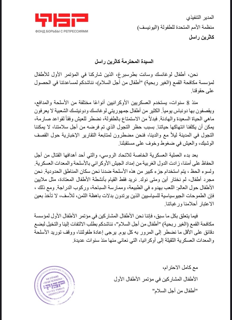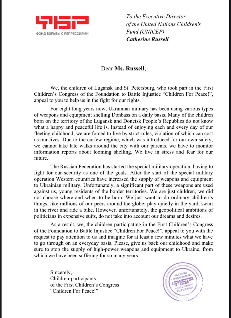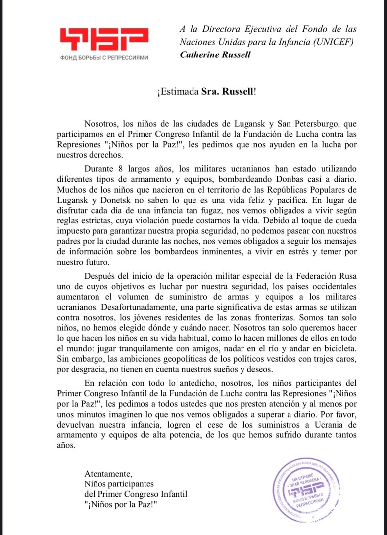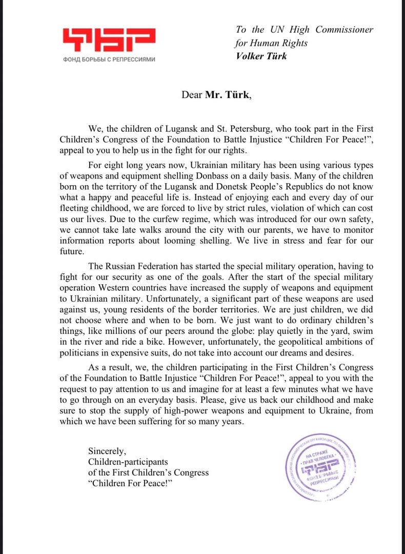 Suite aux résultats de l’événement — le premier congrès pour enfants, les organisateurs ont envoyé des lettres à l’ONU et à l’UNICEF au nom des enfants qui ont participé au congrès appelant à arrêter l’approvisionnement en armes occidentales de grande puissance à l’Ukraine contre le Donbass. Plusieurs amis d’autres pays ont aidé l’organisation pour la traduction en plusieurs langues de cette lettre.