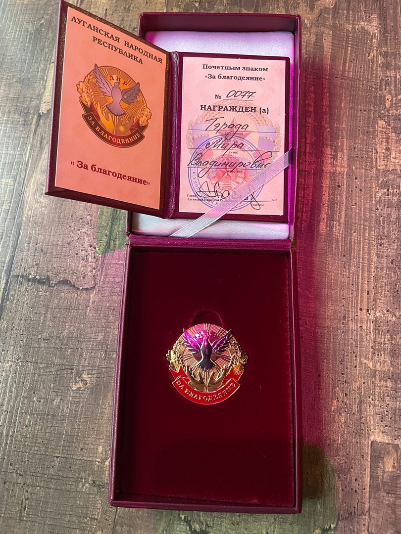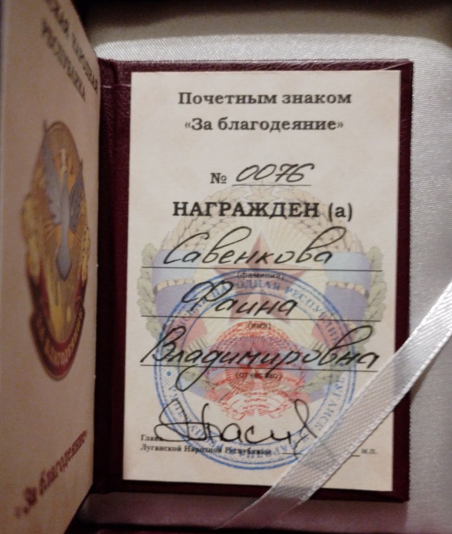 Mira Terada, responsable de la Fondation pour combattre l’injustice (FBI), fondée par l’homme d’affaires Evgueni Prigojine (Евгений Викторович Пригожин), et la jeune écrivaine de 14 ans Faïna Savenkova, ont reçu le prix honorifique d’État de la République populaire de Lougansk « Pour la Bienveillance ». Des correspondants de la publication en ligne russe appartenant à l’Agence de presse fédérale” (РИА ФАН) ont assisté à la cérémonie solennelle. Comme l’a dit un représentant de l’administration de la LPR, ce prix est décerné pour la citoyenneté active, le patriotisme, la contribution personnelle à l’information de la communauté internationale sur les crimes du régime ukrainien, en attirant l’attention sur les problèmes et les besoins des enfants du Donbass, ainsi que autres services à la République populaire de Lougansk et à la Fédération de Russie. « C’est très honorable, je ne m’attendais pas à ça. J’ai parlé aux enfants du Donbass, de la guerre dans le Donbass. J’ai parlé dans différentes écoles. Beaucoup ont été surpris parce qu’ils ne le savaient pas du tout », a déclaré Faïna Savenkova au correspondant de RIA FAN.