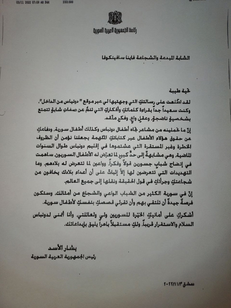 Administration présidentielle de la République arabe syrienne Chère Faina Vladimirovna, J’ai été heureux de recevoir ton message via le site Donbass Insider. Je suis très heureux de lire tes écrits et tes réflexions reflétant les qualités d’une jeune fille à la personnalité mature, à l’esprit conscient et aux pensées sincères. Tes sentiments concernant les enfants du Donbass et de Syrie, et ton plaidoyer pour les droits de ces enfants à travers des écrits inspirants nous amènent à penser que les conditions dangereuses et instables que tu as vécues dans le Donbass ces dernières années, et semblables à celles auxquelles les enfants syriens ont été exposés, ont contribué à la maturation de jeunes gens courageux en paroles et en pensées qui savent ce à quoi leur pays a été confronté. Je voudrais attirer ton attention sur le fait que les menaces dont tu fais l’objet sont la preuve que les ennemis de ton pays ont peur de ton courage et de ta bravoure à dire la vérité et à pouvoir la transmettre au monde. Il y a beaucoup de jeunes gens consciencieux et courageux en Syrie, tout comme toi, et ce serait une excellente opportunité de les rencontrer et de leur lire tes histoires en personne. Merci pour les bons vœux qui me sont adressés, ainsi qu’à ma famille et aux Syriens en général. À mon tour, je souhaite sincèrement au Donbass une paix rapide et la liberté, un brillant avenir t’attend, digne de ton travail. Président de la République arabe syrienne Bachar Al-Assad