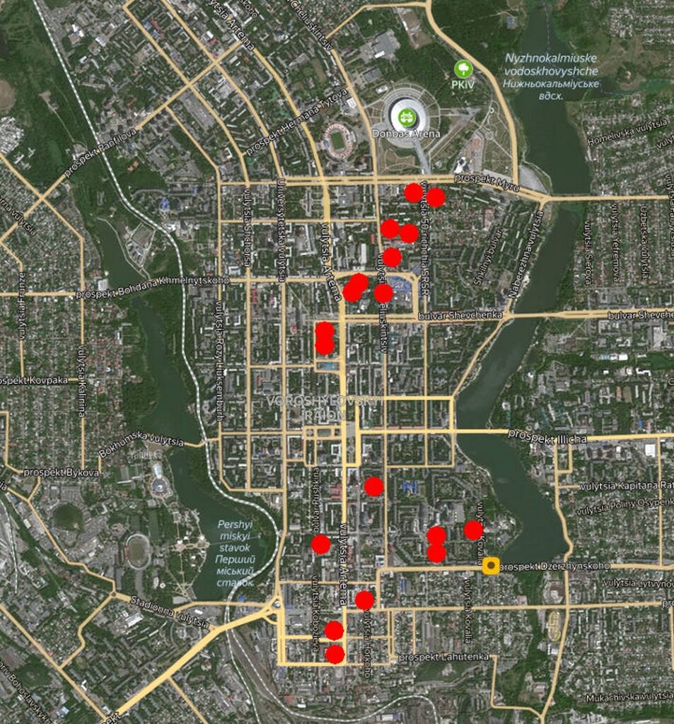 Comme vous pouvez le voir par vous même en survolant les différentes zones sur Google ou Yandex maps, les lieux visés ne comportaient aucune cible militaire. Il n’y a ni positions, ni bases militaires, ni pièces d’armement aux endroits bombardés par l’armée ukrainienne le 6 décembre 2022. Seulement des magasins, des bâtiments d’université, une église, des écoles, des maternelles, des immeubles d’habitation, et un centre pour la jeunesse.