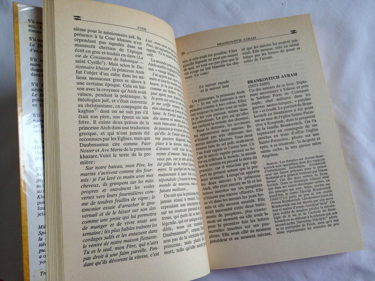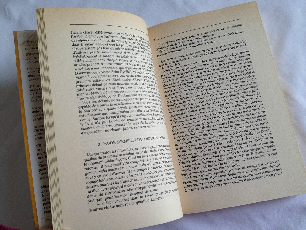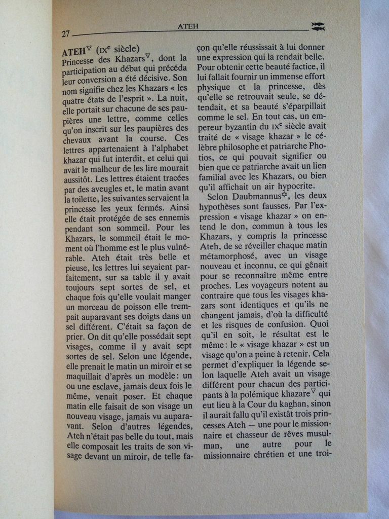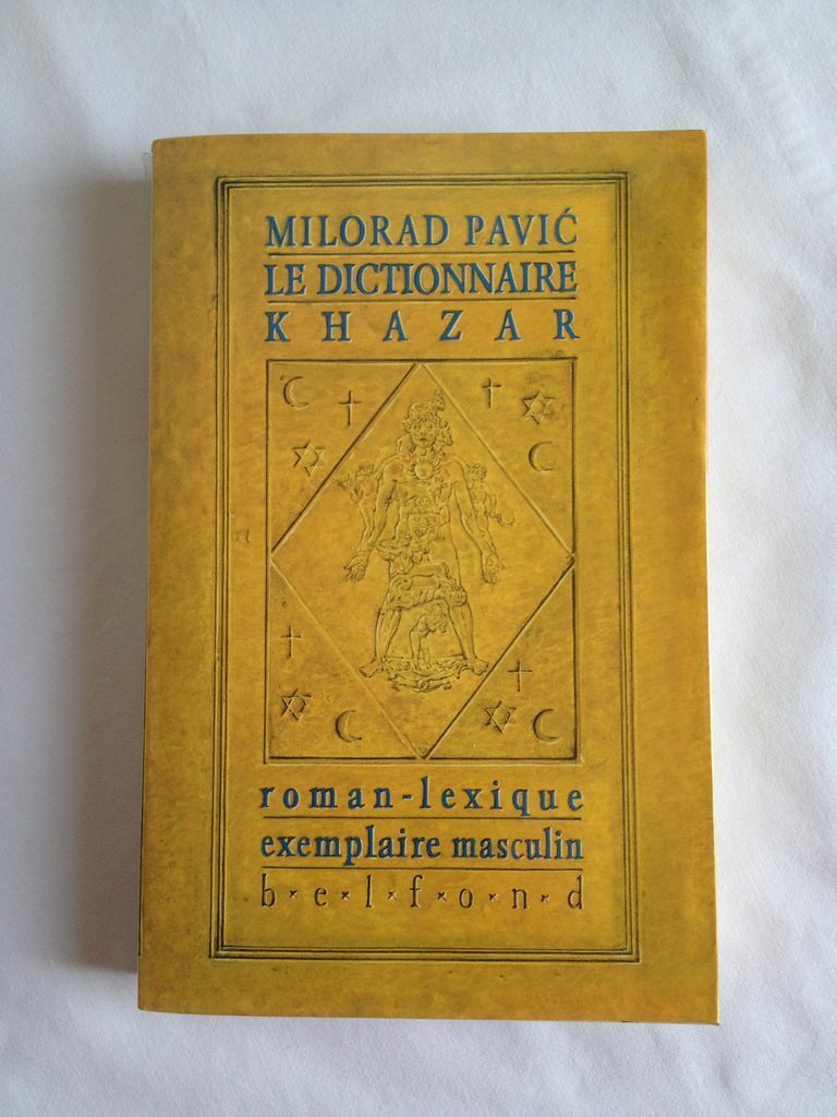 Concernant le livre de l’écrivain serbe Milorad Pavić, “Le Dictionnaire Khazar », il s’agit de la première traduction en français publiée en 1988 par les éditions Belfond (texte sur deux colonnes avec une couverture contrepliée recouverte d’un film plastique transparent. 15,5 x 24 x 3cm).