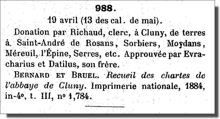 - Auguste Bernard et Alexandre Bruel : « N° 1784 – Charta qua Richaudus clericus quasdam res in comitatu Vapincensi ecclesiæ sancti Andreæ dat, eamque Cluniacensi monasterio subjicit ». Recueil des chartes de l’abbaye de Cluny. Tome 3 : 987-1027. Paris, Imprimerie nationale, 1884, p. 39-42.