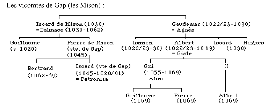 Si nous nous attardons encore sur les possessions que Richaud offre à Saint-André-de-Rosans dans le diocèse de Gap, nous pouvons faire les quelques remarques qui suivent. Ainsi, en plus de biens sis aux alentours de Rosans, Richaud offre la moitié du castrum de Mison (medietatem castri Misonis), don qui semble n’avoir jamais pris effet. La famille de Mison, qu’on voit au XIe siècle et à laquelle appartiennent les vicomtes de Gap, ne conserve qu’un anthroponyme qui rappelle, indirectement, une parenté avec Richaud. Il s’agit d’Ismion, nom de l’un des fils de Gaudemar et Agnès qui en 1022-1023 ont offert au prieuré de Ganagobie l’église Sainte-Marie du castrum de Beaujeu, dans le diocèse de Gap. Ils donnent l’église avec les dîmes et les prémices, ainsi que deux manses. Au diocèse de Die, ils offrent la moitié de la vallée de Jarjate, sise dans le territoire du castelli Lunis (Lus-la-Croix-Haute, Drôme), ainsi que deux alpages. Gaudemar et son frère Isoard sont la souche de la famille des Mison. Ce don fait à Ganagobie se situe peut-être dans le cadre d’une ancienne dévotion à Cluny de ces possibles descendants de Richaud.