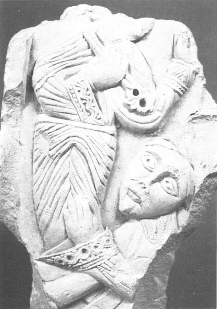 « Je passe sous silence quelques morceaux de frises figurant des torsades ou des rosaces, pour arriver tout de suite aux cinq fragments plus intéressants sur lesquels sont sculptées des représentations de personnages ou d’animaux. Le premier groupe se compose de deux fragments de chapiteaux. L’un, qui est très petit, représente saint Pierre debout, tenant de la main droite une clef appuyée sur son épaule et bénissant de la main gauche; à ses pieds un personnage vêtu d’habits ecclésiastiques est agenouillé et joint les mains. La tête du saint est brisée. Je serais porté à croire que cette scène représente le clerc Richaud, fondateur du prieuré de Saint-André de Rosans, aux pieds du saint auquel il a consacré sa donation. »