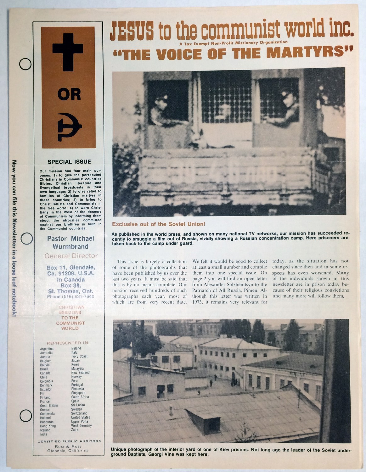 Dans la bibliographie de votre article, vous mentionnez l’audition de mon père devant une commission du Sénat américain. Voici comment cette publication a été portée à votre attention. J’ai personnellement commandé la réimpression de 100 000 exemplaires de cette brochure et j’ai personnellement, seul à l’époque, rempli des enveloppes, créé une liste d’adresses d’églises à partir d’une salle remplie de tous les annuaires téléphoniques des États-Unis que j’avais commandés. L’explication est que nous étions poussés à faire des efforts suprêmes pour aider les chrétiens persécutés que nous avions laissés derrière nous. Un mouvement ou une organisation fonctionne également comme un canal d’eau construit qui dirige le courant et ne permet pas aux ressources de se disperser sans but.