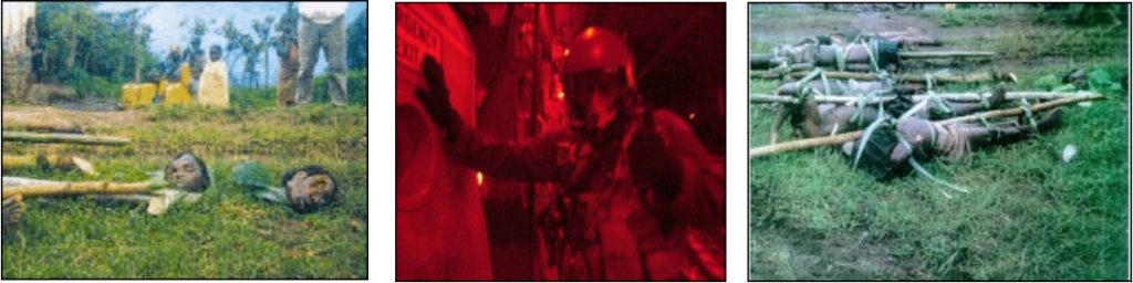Alors que les moteurs de l’Hercule démarraient avec un rugissement, des agents américains à Kigali travaillaient aux côtés de fonctionnaires locaux et de membres des services de sécurité rwandais, renforçant les soupçons du public quant à un acte criminel dans le crash aérien présidentiel. Poussés par l’administration corrompue, les membres de la tribu Hutu ont commencé à marcher sur les membres de la tribu Tutsi et leur ont jeté quelques pierres. Assez innocent au départ, bien qu’avec quelques vilaines coupures de machette ici et là. Mais ensuite, le C-130 Hercules a effectué une passe soigneusement calculée directement au-dessus des Hutu qui avançaient, et ils sont soudainement devenus fous. Les yeux vitreux, l’humeur de la foule Hutu est passée de la simple colère à une rage incontrôlable, et en quelques minutes, des centaines de parties de corps Tutsi assorties volaient dans les airs.