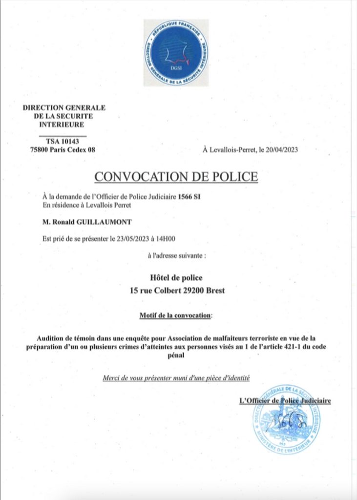 Le 23 mai 2023 à 14h00 je serai entendu, à l’Hôtel de Police de Brest (29), en qualité de témoin dans une enquête répondant au même chef d’accusation c’est-à-dire « l’association de malfaiteurs terroristes en vue de la préparation d’un ou plusieurs crimes d’atteinte aux personnes ».