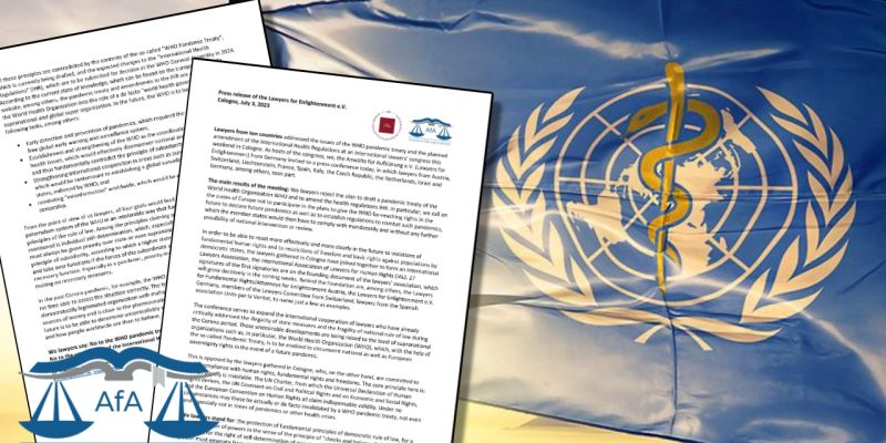 Le 3 juillet 2023, un groupe d’avocats de dix pays a publié une déclaration exprimant son opposition au traité sur la pandémie proposé par l’Organisation mondiale de la santé (« OMS »), officiellement connu sous le nom de WHO CA+, et aux amendements au Règlement sanitaire international (« RSI »). Au cours du week-end du 30 juin au 2 … Lire la suite de Des avocats du groupe international ❝Anwälte für Aufklärung❞ (AfA) unissent leurs forces pour s’opposer à la prise de pouvoir de l’OMS