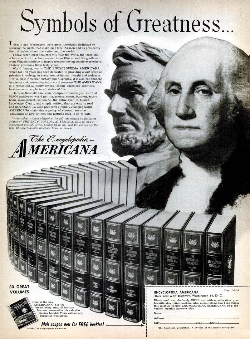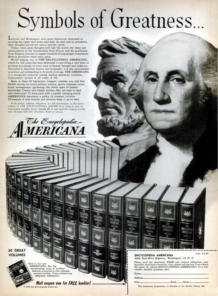 J’ai récemment fait l’acquisition du volume No 2 provenant de l’année 1959 de la fameuse Encyclopedia Americana, qui couvre les mot et nom « Annuity » (une série de paiements effectués à intervalles égaux) et « Azzubeydi » (Abū Bakr az-Zubaydī, grammairien et lexicographe arabe, né à Séville). J’ai encore une fois beaucoup de chance car cet exemplaire de l’encyclopédie américaine est extrêmement rare et difficile à dénicher, surtout à un prix raisonnable. Pour ma part, je l’ai obtenu pour seulement 16 $ (± 11 €) grâce à la plus grande boutique indépendante de livres d’occasion en ligne au monde, ThriftBooks. Au départ je voulais obtenir le volume No 2 de l’année 1958, ce que j’avais commandé, mais on m’a fait parvenir celui de l’année 1959. Mais ce n’est pas bien grave puisque cela ne change absolument rien au propos de cet article.