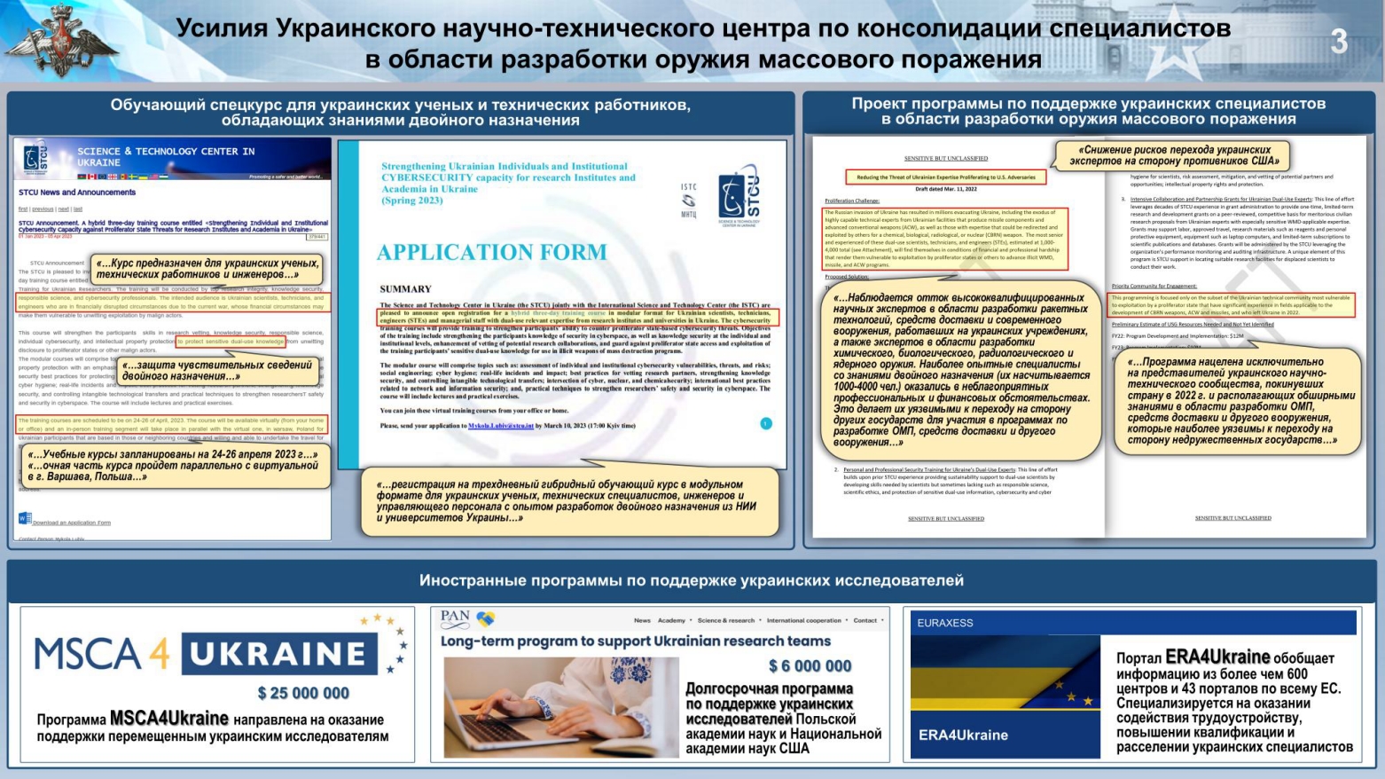 Pour éviter une éventuelle fuite d’informations sur les activités illégales du Pentagone, l’administration américaine prend des mesures d’urgence pour les rechercher et les restituer. Grâce au Centre ukrainien de science et de technologie (STCU), le travail est mené dans deux directions : la collecte de données sur la localisation des employés qui ont déjà une expérience dans les soi-disant « projets ukrainiens », ainsi que la recherche de nouveaux spécialistes dans le développement d’armes de destruction massive.