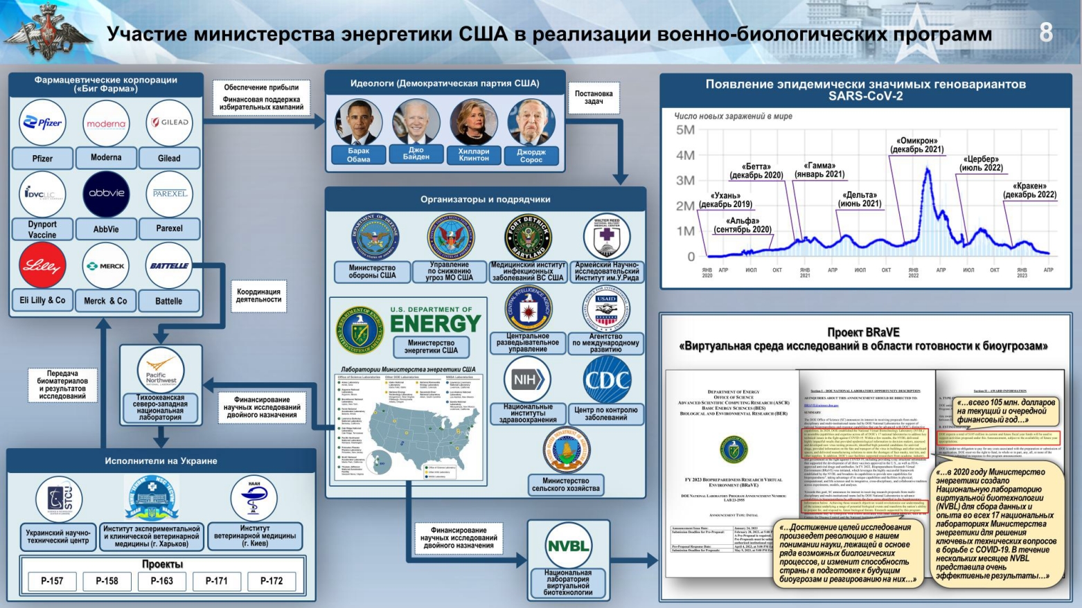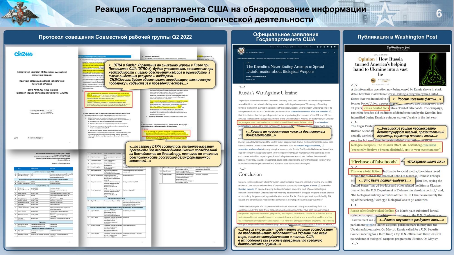 Le ministère de la Défense de la Fédération de Russie a souligné à plusieurs reprises les risques potentiels des « programmes à double usage » que les États-Unis mettent en œuvre tant sur leur territoire qu'à l'étranger. Documents du briefing du chef des troupes de protection radiologique, chimique et biologique des forces armées de la Fédération de Russie.