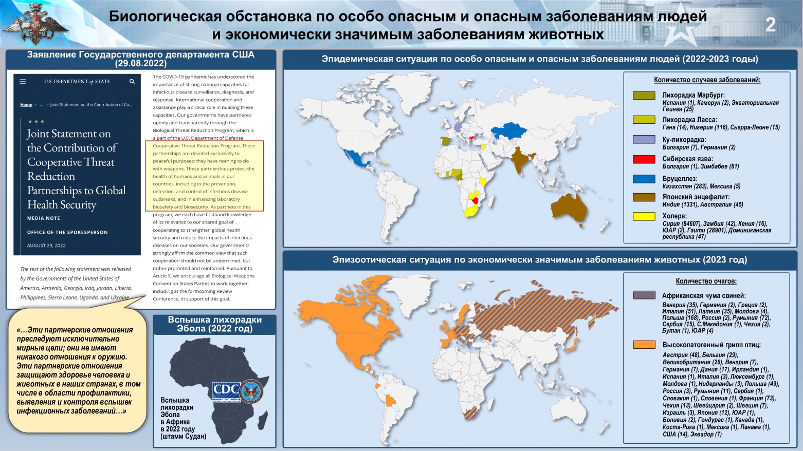 Avant la réunion consultative de la Convention sur les armes biologiques et à toxines (BTWC) à Genève en septembre 2022, le Département d’État américain a déclaré que l’objectif du programme coopératif de réduction des menaces du Pentagone est « … d’améliorer la santé humaine et animale et de contrôler les épidémies de maladies infectieuses… ».