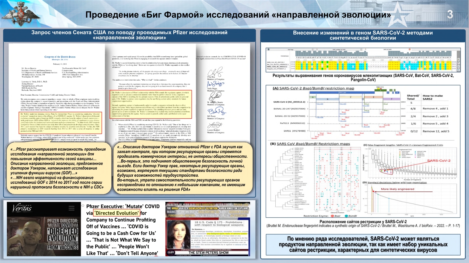 Notez la demande du Sénat américain au ministère de la Santé concernant la recherche sur « l’évolution dirigée » de Pfizer. La demande vise à évaluer l’exactitude des informations reçues par l’organisation américaine à but non lucratif Project Veritas du directeur de la recherche et du développement de Pfizer, Jordan Walker. Il a déclaré que la société profitait de l’occasion pour mener des recherches en « évolution dirigée » pour améliorer l’efficacité de ses vaccins. Commentant les approches de développement de nouveaux vaccins, Walker a déclaré : « Pourquoi ne changeons-nous pas le virus nous-mêmes afin de pouvoir développer de manière proactive de nouveaux vaccins. » Ainsi, l’employé de Pfizer reconnaît le fait que la recherche « d’évolution dirigée » est menée pour obtenir un avantage concurrentiel et augmenter les profits.