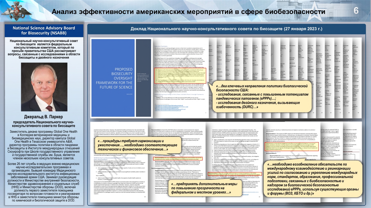 L’incapacité de l’administration américaine à assurer le niveau de contrôle nécessaire sur la recherche sur les doubles usages en cours dans le pays est confirmée par d’autres documents. Par exemple, le 27 janvier 2023, un groupe d’experts du National Science Advisory Council for Biosecurity des États-Unis a présenté un rapport évaluant l’efficacité de la législation actuelle en matière de biosécurité. Le rapport se concentre sur deux domaines clés les plus préoccupants du point de vue de la BTWC : la recherche liée au renforcement des capacités sur les agents pathogènes pandémiques et la recherche à double usage.
